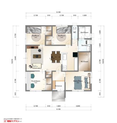 主寝室と2部屋の間にLDKを設け、北側2部屋の間をクローゼットで挟んだ間取りにすることで、生活音をシャットアウトした平屋。南側には広めのスタディスペースを設置し、勉強や仕事などができる空間をつくっています。各居室の面積が限られる場合、家族兼用で使えるスタディコーナーやフリースペースなどを一部屋設けておくとよいでしょう。