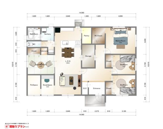 南側にペット用のスペースと書斎を設け、明るい居室に仕上げた平屋。部屋の中央にはウォークスルークローゼットを設置することで、回遊性の高い間取りとなっています。