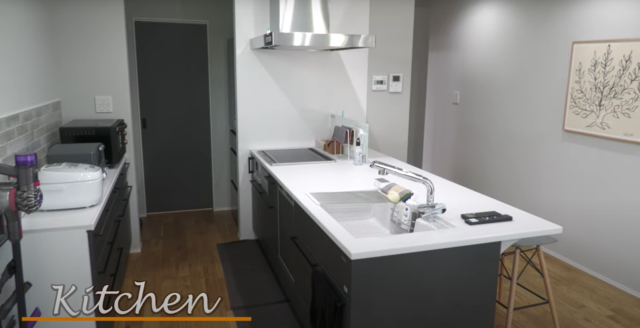 キッチンは黒を基調としたシックなものに。キッチン台を広くしてカウンタースペースを作っている点もおしゃれですよね。またキッチン奥にはパントリーと冷蔵庫があります。キッチンに立たないと見えない冷蔵庫の位置が注目ポイント。生活感を見せない、考え抜かれた間取りが魅力的です。
