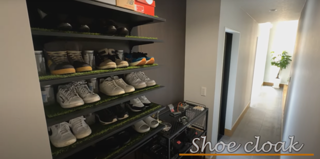玄関に入ると、DIYでつくったおしゃれなシューズクロークがお出迎え。靴の下には人工芝を敷き、アウトドアな雰囲気漂う、一線を画した空間を確立しています。将来的に靴が増えても棚を増設できるよう、あえてDIYを想定したつくりにしたそう。「今」だけでなく将来を見据えた設計が何とも素敵ですよね。
