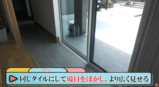 リビングには玄関土間が地続きになっており、珍しい間取りに。土間タイルは外構のタイルデッキと同じものを使うことで境界線をぼかし、空間が広く続くような視覚効果を編み出します。土間スペースが続くことで自転車やバイク、またアウトドア用品などを手軽に置くことができます。