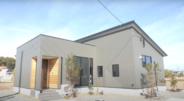 強すぎない淡いグレーの外壁で、モダンナチュラルな雰囲気に仕上げた平屋住宅。玄関の木材がよいアクセントとなっていますね。