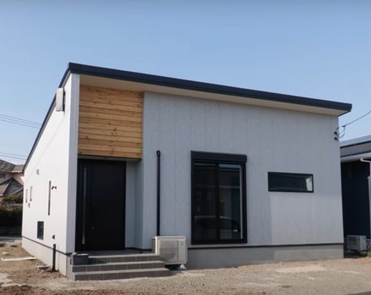 玄関付近の木材がよいアクセントとなった平屋住宅。木材が浮かないよう、くすみがかったホワイトを外壁色として使用しています。