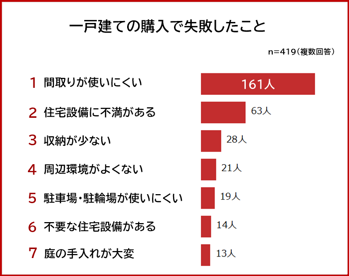 一戸建ての購入経験がある419名に「一戸建ての購入で失敗したこと」を聞いたところ、1位は「間取りが使いにくい(161人)」でした。
