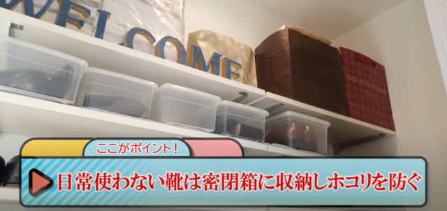 蓋付きの透明ケースを活用することで、ホコリの侵入を防げるよう工夫しています。日常的に使わない靴は箱にしまっておくことで、靴を長くきれいに保てます♪