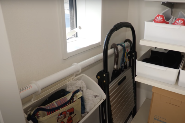 シューズクロークに突っ張り棒を設置すれば、傘やちょっとした小物を掛けられる空間に早変わり。とくに折り畳み傘などは、いざ持っていく際に「どこに置いたっけ…?」と悩む方も多いのではないでしょうか。