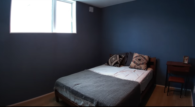 寝室にはプロジェクターを設置し、壁全体に映る内装に。壁いっぱいに映像が映し出される、モダンでおしゃれな内装が魅力的ですよね。時計やホームシアターとして活用でき、映画好きにはたまらない内装でしょう。