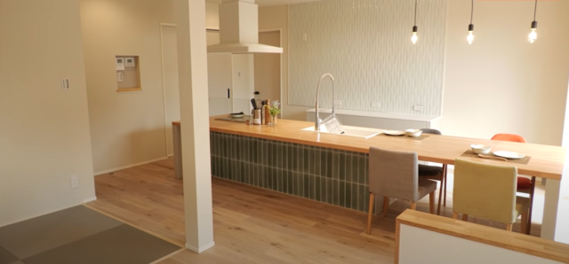 キッチンとダイニングテーブルを一体化させることで、横一列の動線となった一体型のキッチン。内装全体がモダン×ナチュラルな空間に仕上がっています。椅子の位置を変えると、カウンターキッチンのように活用できる点もポイントです。キッチン台の側面はグリーンのタイルを貼り、おしゃれカフェのような内装に。椅子の色もそれぞれ異なるものを採用し、唯一無二のおしゃれな雰囲気に仕上がっていますね。