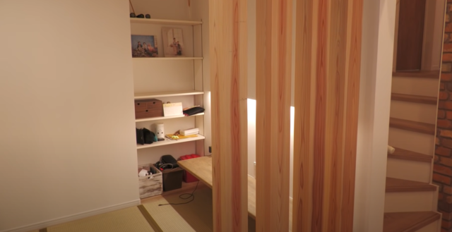 和室は木材の格子を使い、リビングと雰囲気を分けられるよう工夫。まさに和モダンな雰囲気が大変おしゃれですよね。また和室にカウンターを設置することで、子どものスタディコーナーとしても使用できる空間になっている点もポイント。ネックである平屋のプライバシー問題も、格子があるため軽減できており、リビングで思い思いの過ごし方ができる内装となっていますね。