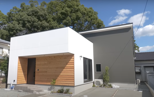 外観は白×グレーでクールに魅せ、玄関は木材をふんだんに使った平屋実例。屋根が平たんになっている「陸屋根」のスタイルで、線の細いスタイリッシュな空間を演出しています。白とグレーの切り替えも、モダンなポイント。コンパクトな平屋でも存在感のある、おしゃれな外観となっています。