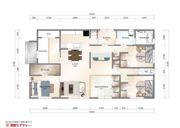 LDKにフリースペースを設置した36坪で3LDKの平屋。LDKにフリースペースと和室を設けることで、過ごし方が限定されない間取りを実現しています。