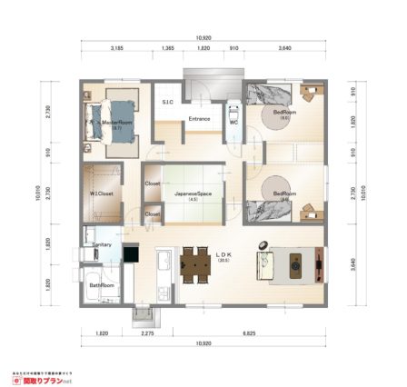 中央に和室を設けて回遊性を高めた32坪の3LDK平屋。平屋は部屋間の移動距離が長くなりがちである一方、回遊性を意識してくるくると回れる動線にすることで部屋間のつながりが生まれ、移動距離を短く抑えられます。